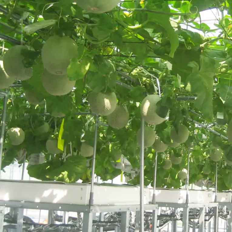 特別な水耕栽培システムで育てられたメロンは、清潔な環境で健康的に成長します。栄養が均等に行き渡る仕組みが整っており、メロン同士で栄養を奪い合うことなく、ストレスフリーでのびのびと育ちます。その結果、甘くて美味しいメロンが出来上がります。