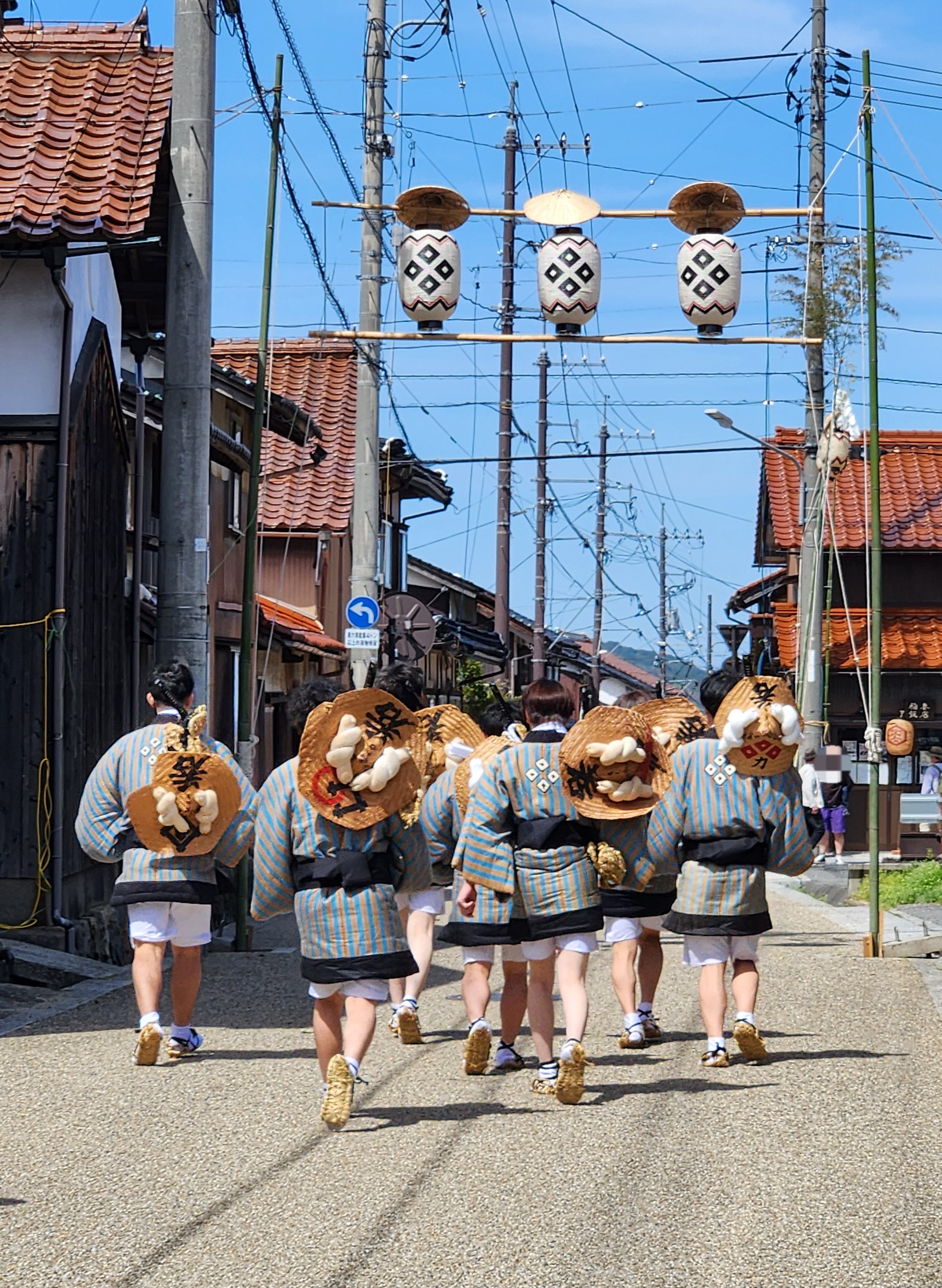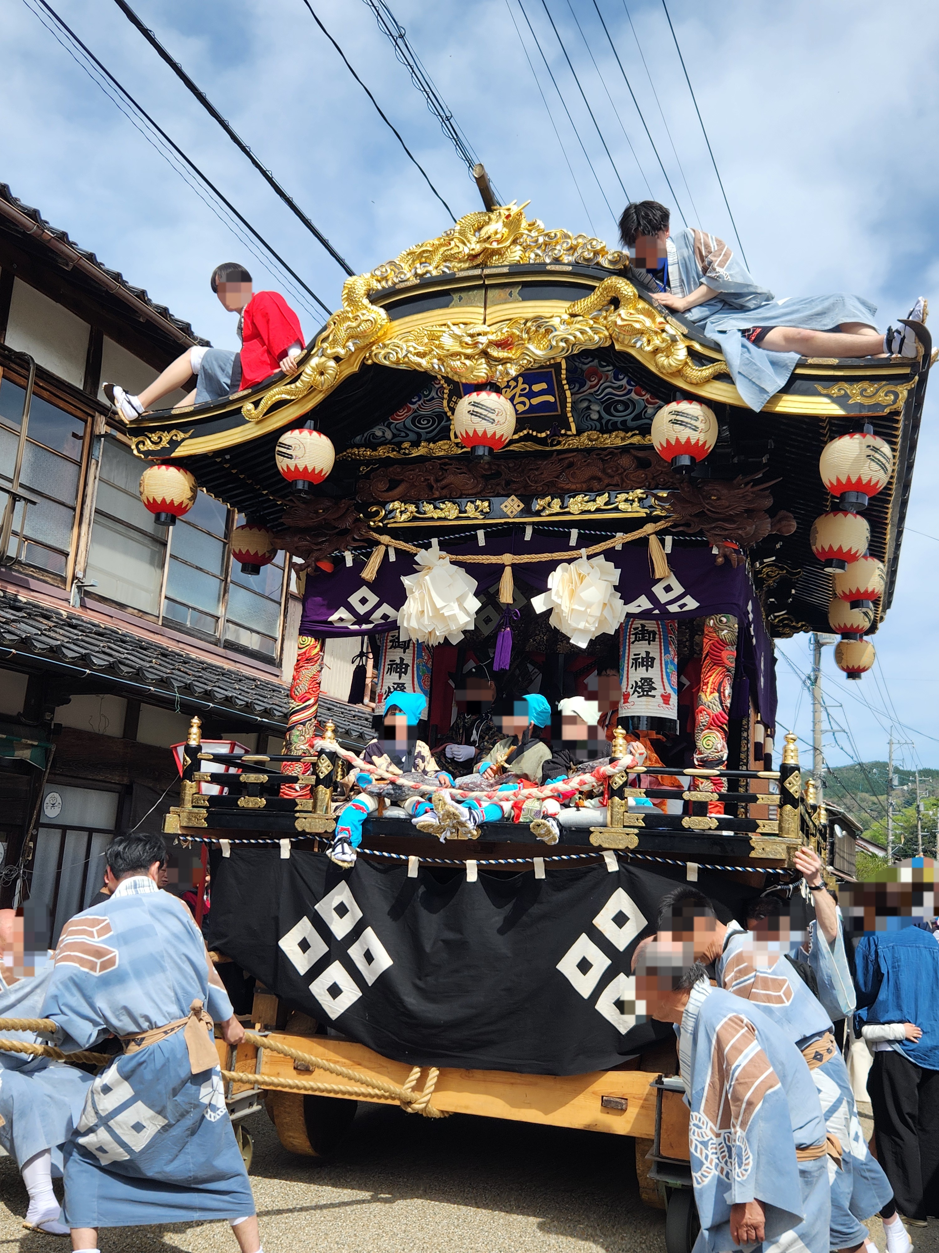翌日は本祭りが行われます。活気に満ちたこの日は、4台の屋台をはじめ、お神輿や榊、猩々・獅子舞、武者行列がゆっくりと町を練り歩きます。夜中まで続く賑わいは、お祭りの醍醐味を存分に味わえます。