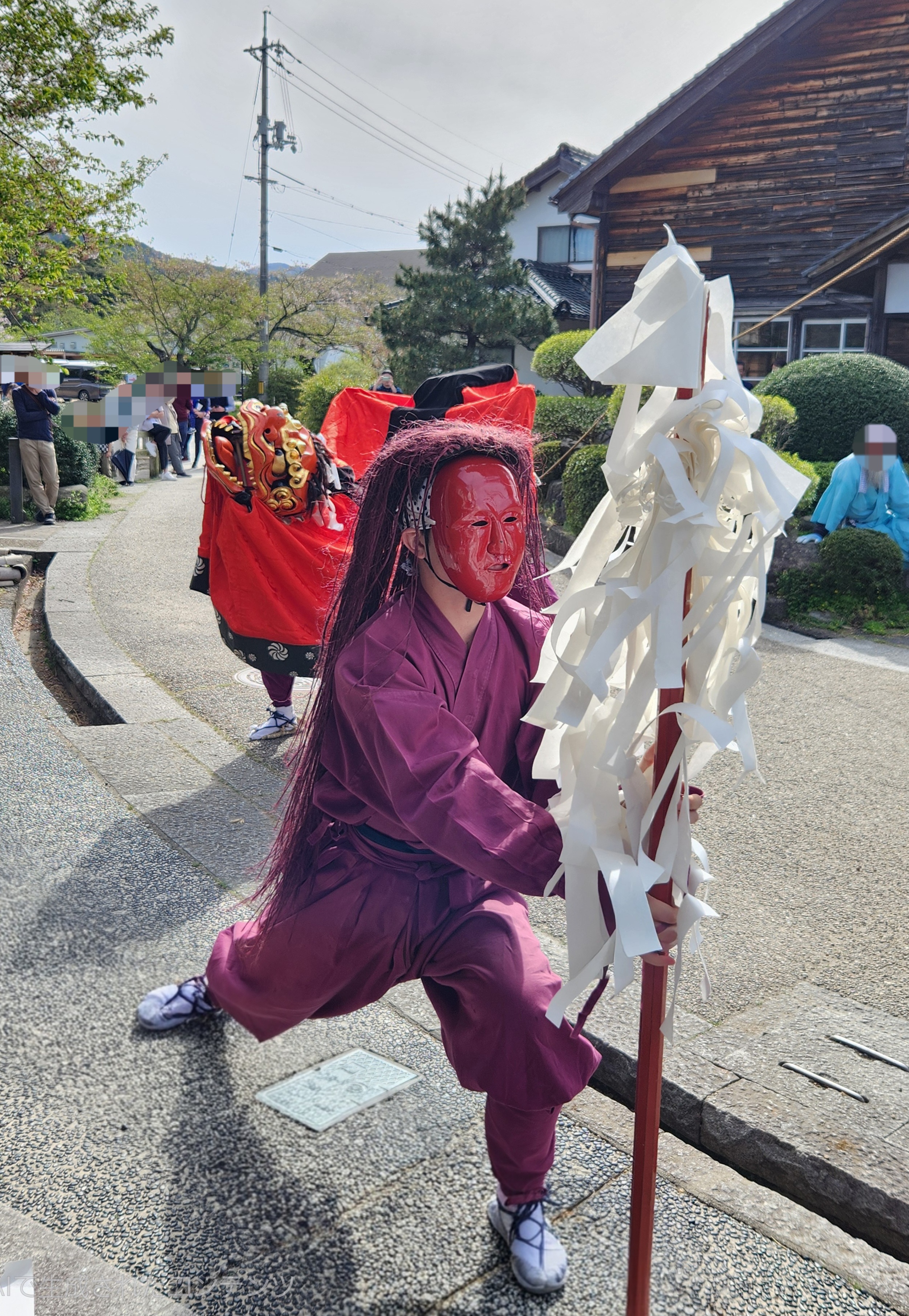 まず、宵祭りから始まります。夕暮れ時に城山神社で神事が行われ、その後、高張り提灯や榊、神輿が下山します。神社から麓まで、約100個の提灯が綱につながれて静かに流れる様子は、幻想的で心に残る光景です。
